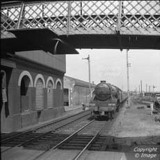 Framed by the station footbridge, A3 Pacific 60073 "St.Gatien" approaches Newark 14/5/59 [102088]
