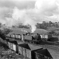 Churchward 2-8-2 heavy tank loco 7250 hauls a train of empty coal wagons at Bargoed 1964 [100623]