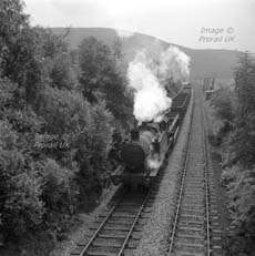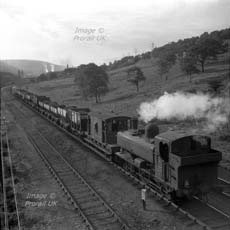 0-6-2T 5610 heads freight along the singled section at Bedlinog 8/63 (with 5632 banking) [100358]