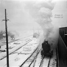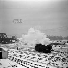 Hawksworth 0-6-0PT 1507 pulls out of Old Oak Common carriage sidings in snow 31/12/61 [100123]