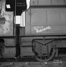 King 4-6-0 6010 at Southall MPD 1964 - with "Balls to Beeching" comment on tender! [100142B]