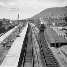 Castle class 7017 "G.J. Churchward" pauses at Port Talbot during station reconstruction 4/61 [100601]