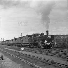 Collett 0-6-0PT dock shunter 1368 hauls china clay wagons at Boscarne Junction 1964 [100077E]